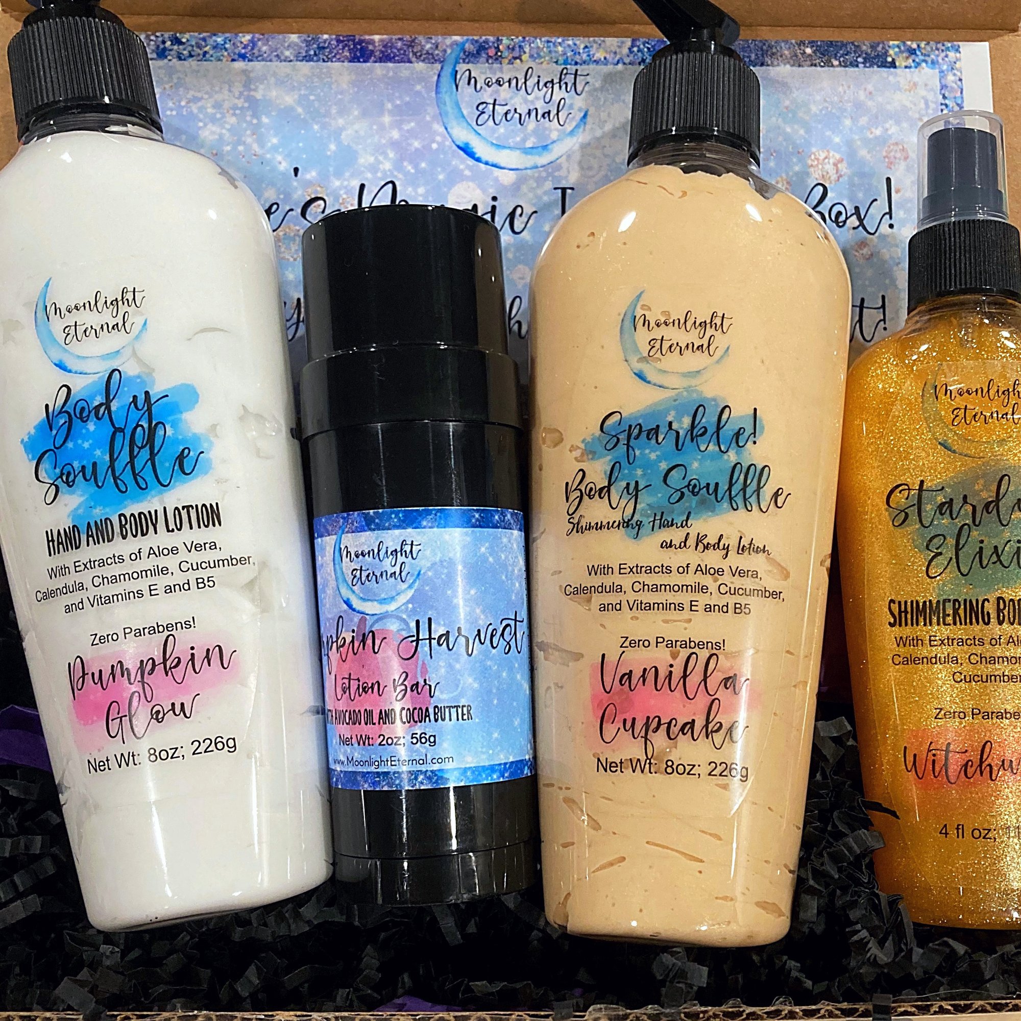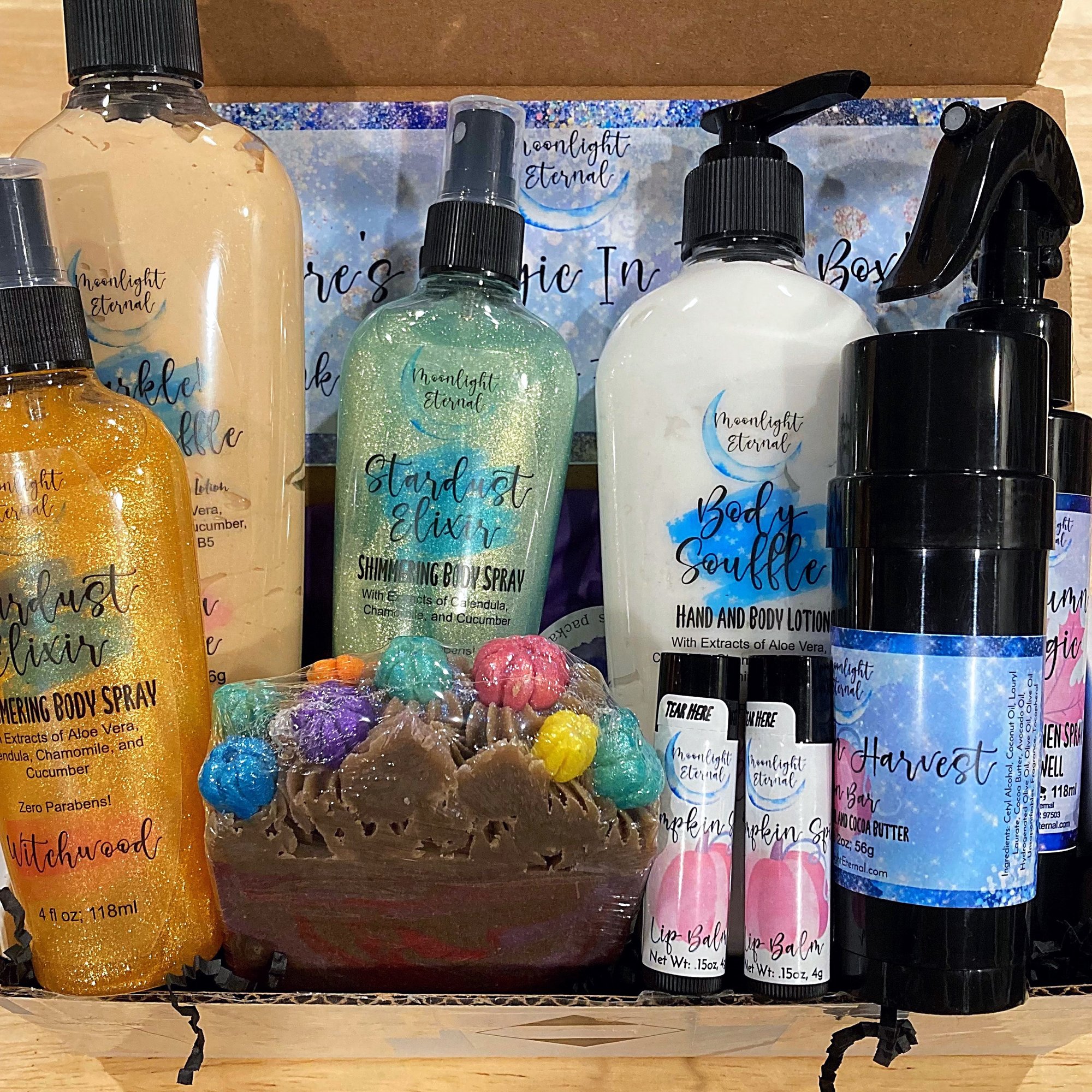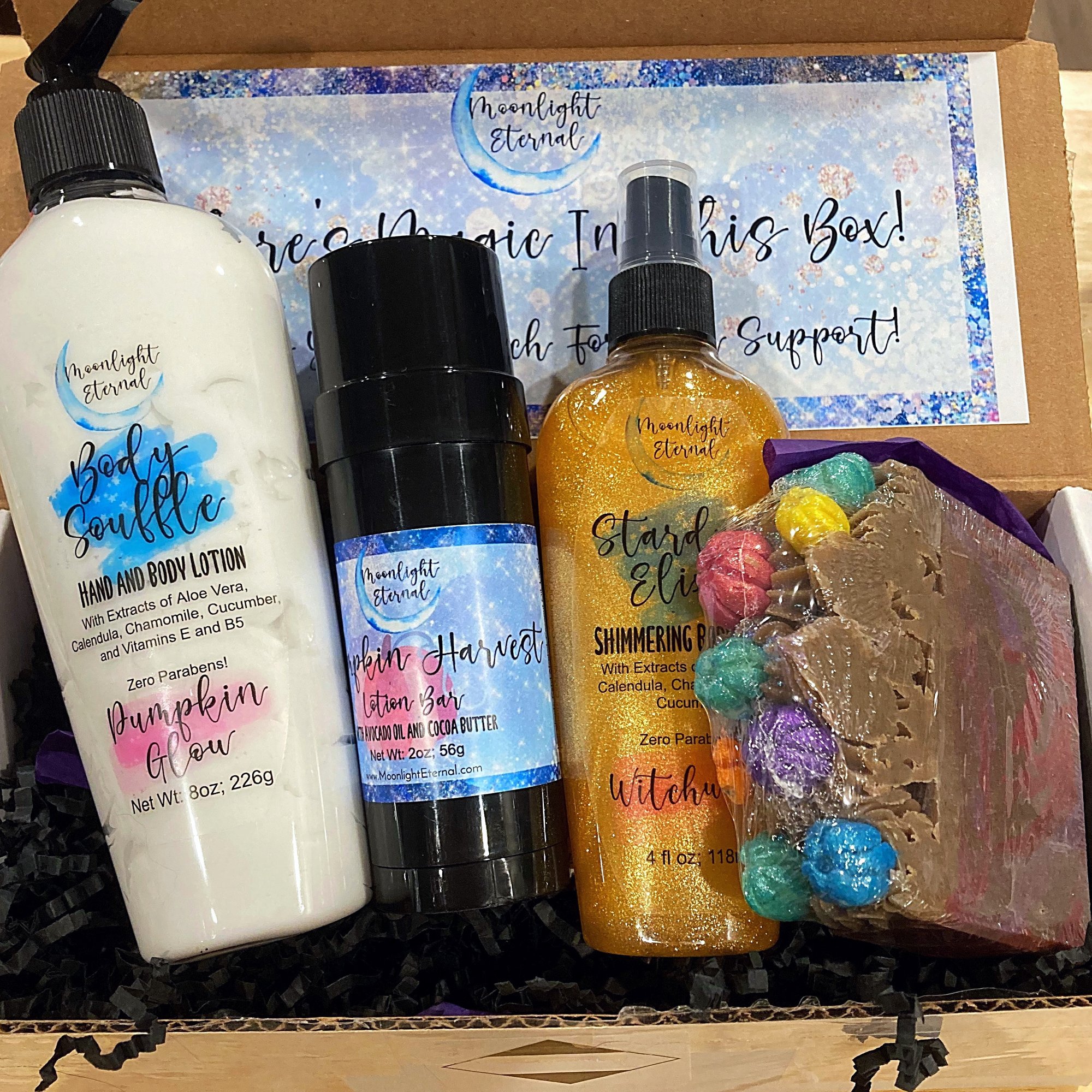 Discover your next Moonlight Eternal favorite with our mystery boxes! Each mystery box includes multiple products, with no scent repeats. Products may include our luxurious lotion bars, artisan soaps, moisturizing lotions, nourishing body oils, shimmering body sprays, and more! Each box is designed to bring a touch of magic to your skincare routine and is filled with a mix of fragrances to keep you feeling your most enchanted. Perfect for gifting to yourself or someone special, this mystery box offers the thrill of discovery with products that indulge, moisturize, and inspire.